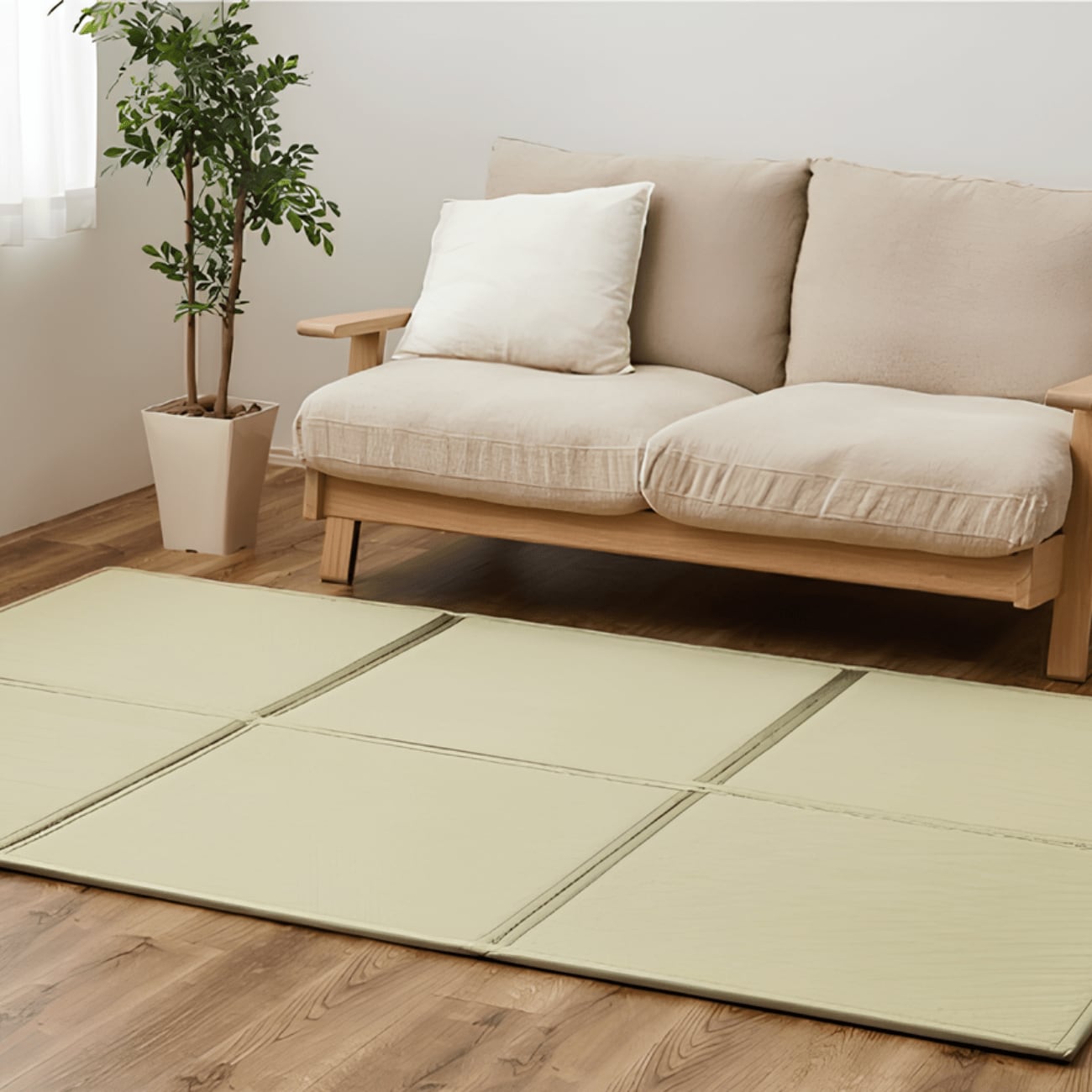 置き畳を縫製して繋げ、折りたためるい草風連結置き畳として登場。