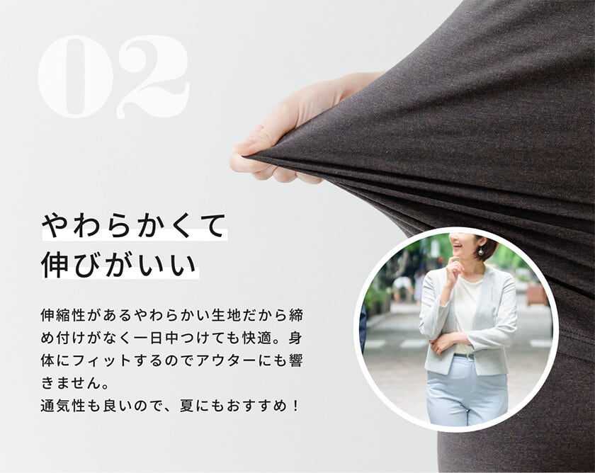 締め付けず、よく伸びる薄手の生地なので、デイリー使いに最適です。