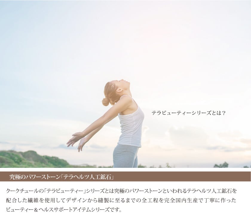 テラヘルツ人工鉱石を配合した繊維を使用してデザインから縫製に至るまでの全行程を、完全国内生産で作ったビューティー&ヘルスサポートアイテムシリーズです。